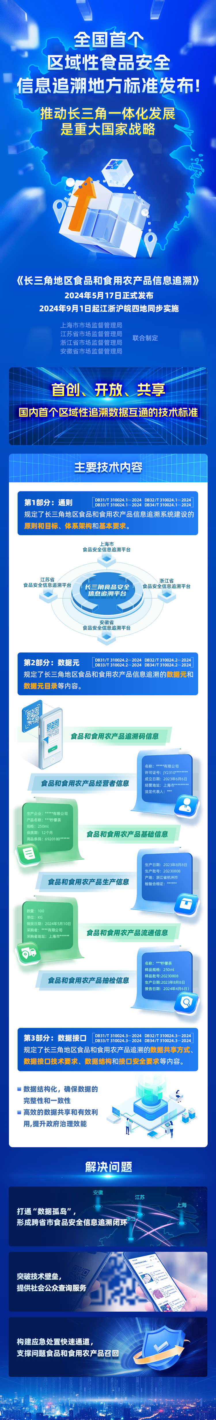 為深入推進(jìn)長(zhǎng)三角食品安全監(jiān)管一體化,在上海市、江蘇省、浙江省、安徽省市場(chǎng)監(jiān)管局共同推動(dòng)下,《長(zhǎng)三角地區(qū)食品和食用農(nóng)產(chǎn)品信息追溯》正式發(fā)布并于2024年9月1日在長(zhǎng)三角地區(qū)同步實(shí)施。作為全國(guó)首個(gè)區(qū)域性食品安全信息追溯地方標(biāo)準(zhǔn),對(duì)提升長(zhǎng)三角區(qū)域食品安全共治水平具有重要意義。